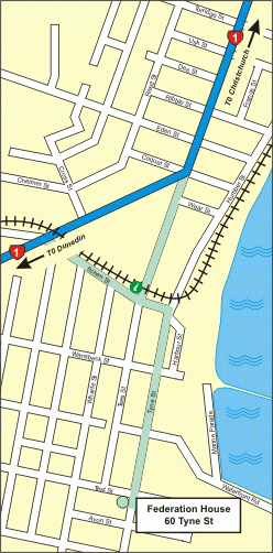 Turn off Highway 1 into Lower Thames St, turn into Itchen St, turn right into Tyne St, proceed past the historic precinct to half way up the hill to Cape Wanbrow Lookout, turn right into 60 Tyne St. by the Federation House sign.